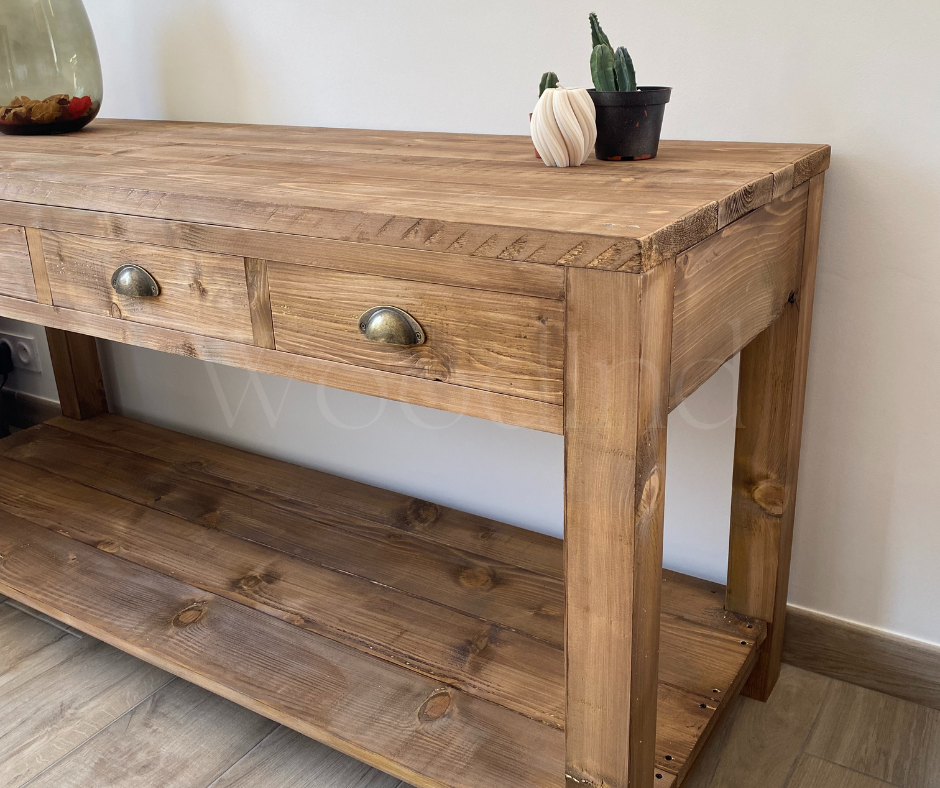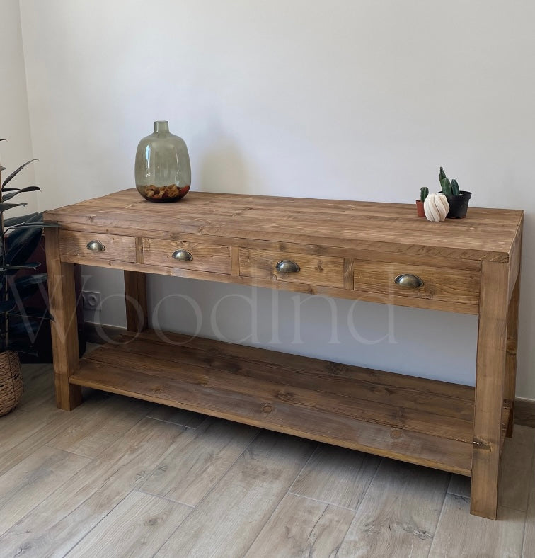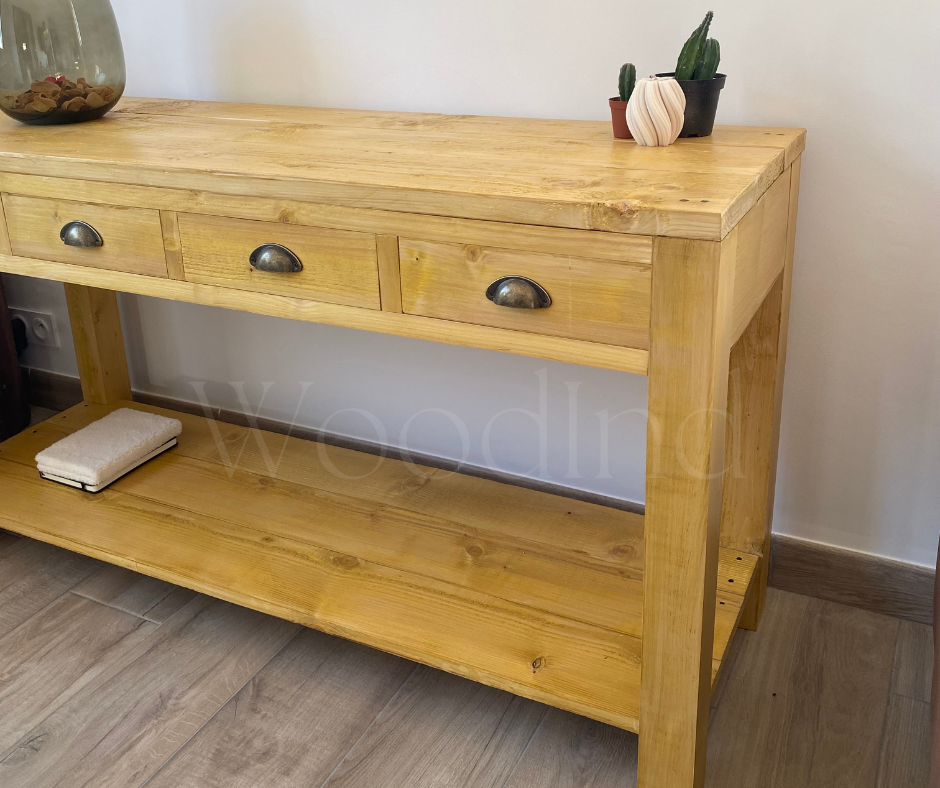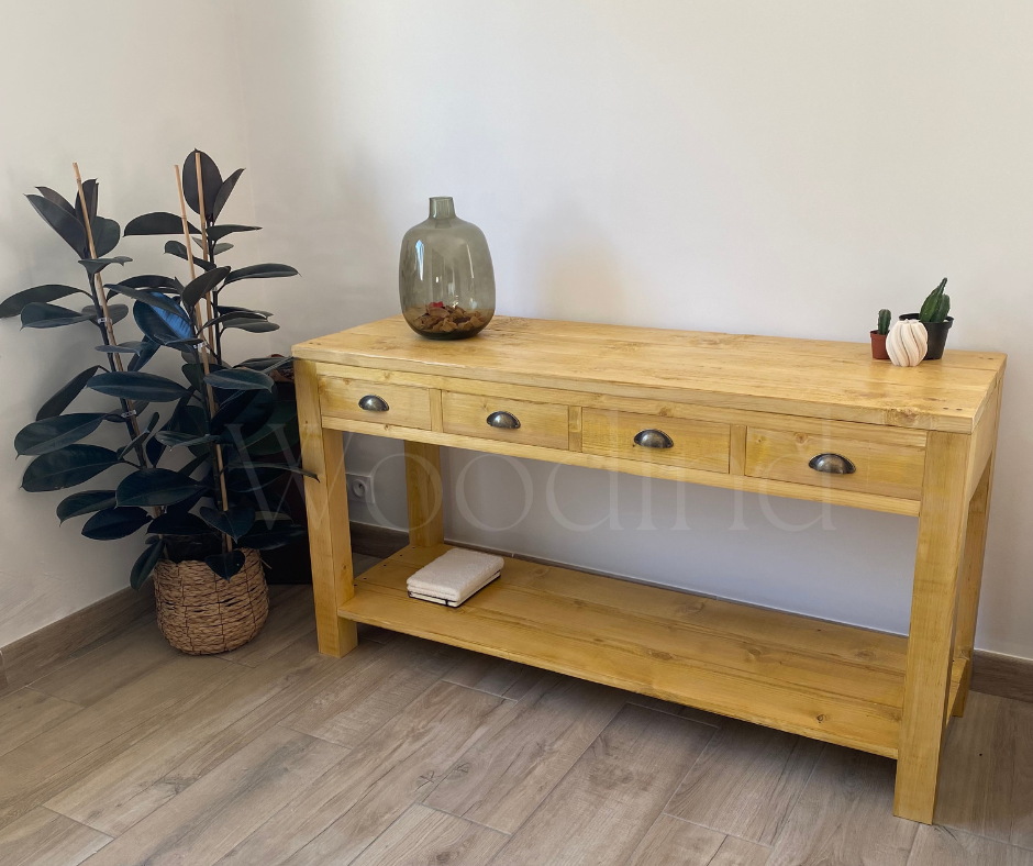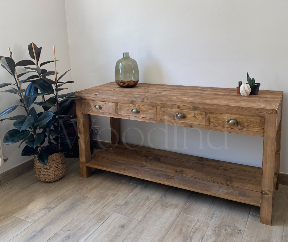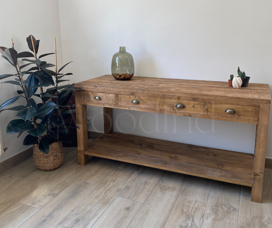 La console bois Marc est fabriqué à la main avec du bois brut de qualité. Cette console d'entrée est sur-mesure et personnalisable. Cette console vintage possède un plateau de 3cm, des pieds carrés, des faux tiroirs qui sont là pour cacher la tuyauterie et un plateau de rangement. Son style épuré s'adapte à toutes les déco. Elle peut être fabriqué en grande console ou en petite console, c'est le principe du sur-mesure, nous nous adaptons à vos besoins!
